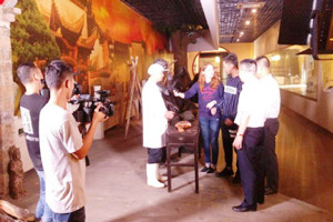 在《常中丞笔记》中,火腿叫做兰熏,《东阳县志》称熏蹄,《本草求原》称南腿,由此可观,火腿此物名声深远,颇受众人喜爱,不然也不会有如此多的“小名”。 10月17日这天,浙江经视旅游节目《48小时》摄制组团队在中国火腿博览馆、世界火腿博览馆开始了“火腿”的探索之旅,从起源伊始谈至繁华盛宴,期间故事种种万千。 从中国火腿博览馆入口处的“百姓劳军图”便开始了这场对话。而在博览馆内的火腿制作流程雕塑则完全将摄制组吸引,无论是考验刀工的制作火腿头道工序——修胚,还是考验“盐功”的——上盐环节,都深
